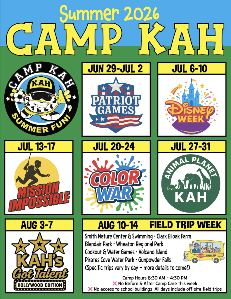 MCPS has updated its school schedule… again! And we have adjusted our camp schedule to align with their 1st day of school for the 2026-2027 school year, as well as the NEW last day of school. There will now be 8 weeks of camp, starting June 22nd and ending August 14th, with our last week of camp (Aug 10 – 14th) being a field trip week, 8:30am – 4:30pm.